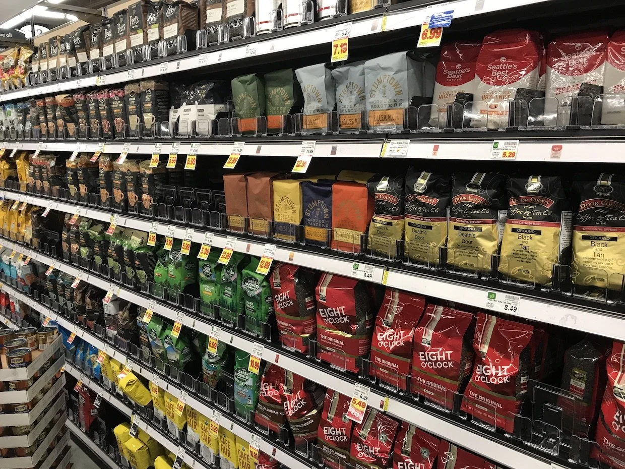 Stump’s carries our full line-up of coffees in 12oz bags! You will find them organized by roast level our lightest roast, Ethiopian Yirgacheffe, on the top left is our lightest roast, and our dark roast French Roast on the bottom right. Each coffee is available in whole bean or pre-ground for your convenience.